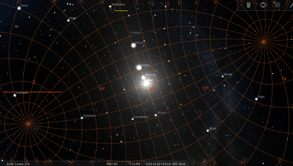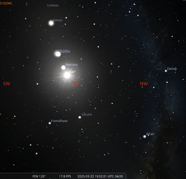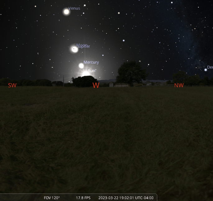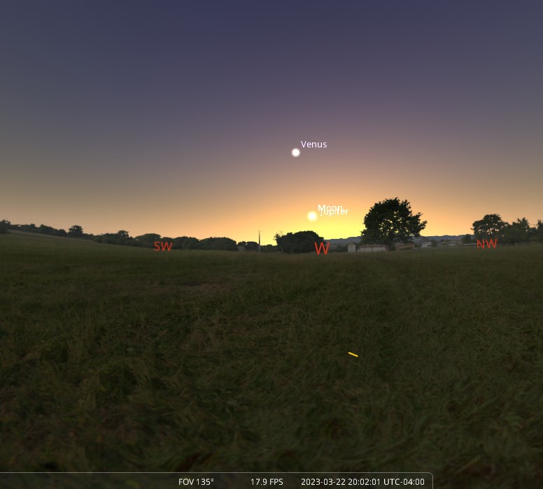 WHAT YOU SEE IN THE SKY AT SUNSET ON MARCH 22 2023. JUPITER IS TOO CLOSE TO SUN FOR US TO BE ABLE TO SEE. WHEN IT IS CLOSE TO THE NEW MOON, MOON IS WITH SUN AND AGAIN DUE TO THE BRILLIANCE OF SUNLIGHT, WE CAN’T SEE HER EITHER.